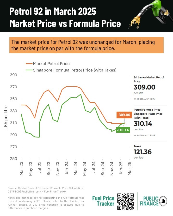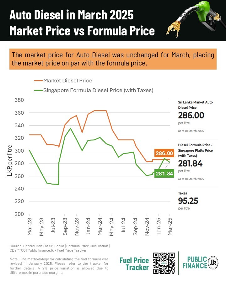 Since December 2024, the market prices of 92-octane petrol and auto diesel have remained at LKR 309 and LKR 286 per litre, respectively, despite fluctuations in formula prices between January 2025 and March 2025.