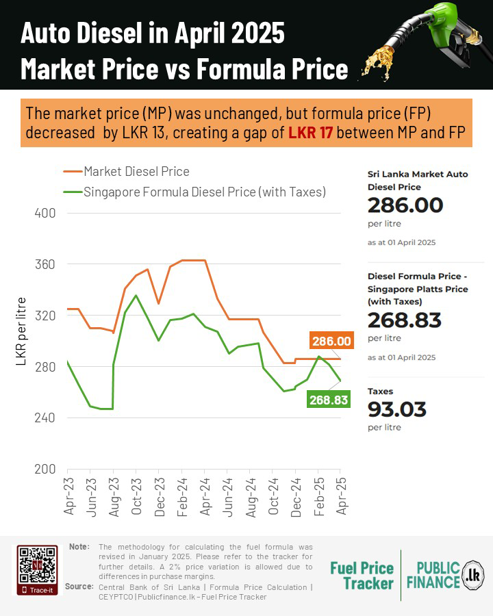 At the same time, the market price of Auto Diesel has remained unchanged at LKR 286 per litre since December 2024. It therefore, now misaligned with the formula price calculation for Auto Diesel which is LKR 269.