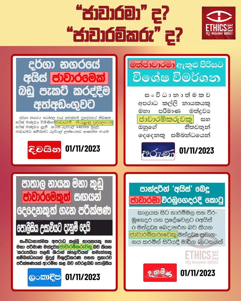 On November 1, 2023, the Divaina, Aruna, Lankadeepa, and Dinamina newspapers reported the arrest of a drug dealer who was referred to using the derogatory term "Jawarama" (ජාවාරමා). This usage violates media ethical guidelines.