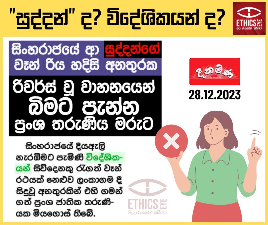 On December 28, 2023, Dinamina reported that a group of foreign nationals had an accident while visiting Sinharaja Forest. The headline used the derogatory term "සුද්දන්ගේ" (Suddange) to refer to foreigners based on skin colour, while the article itself used the appropriate term "wideshikayan" (විදේශිකයන්). Media is discouraged from using such derogatory language to refer to foreign nationals, as it can contribute to discrimination.
