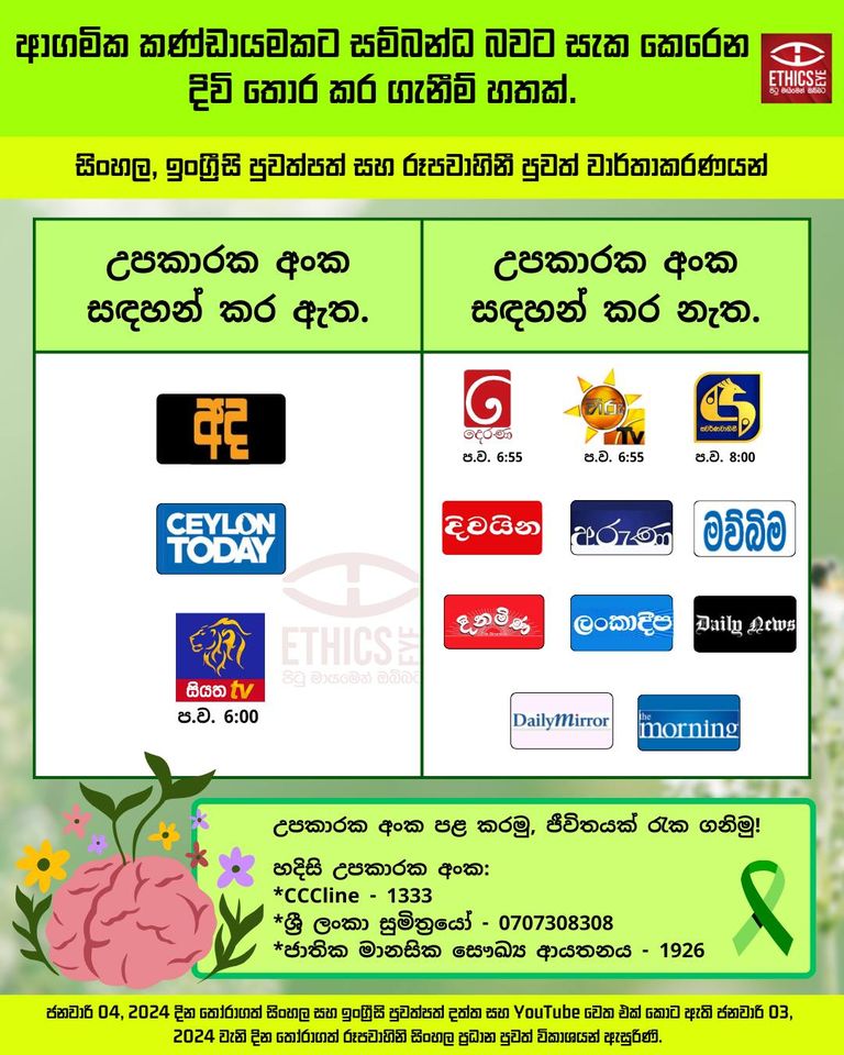 This infographic illustrates how seven suicides, suspected to be linked to a religious group, were reported in Sinhala and English newspapers on 4 January 2024 and on prime Sinhala television news bulletins on 3 January 2024. Following media guidelines, Ada, Ceylon Today newspapers and Siyatha TV included helpline numbers when reporting the incident. Divaina, Aruna, Mawbima, Dinamina, Lankadeepa, Daily News, Daily Mirror and The Morning newspapers, along with Derana, Hiru and Swarnavahini TV channels, reported it without helpline numbers and did not comply with media ethics.