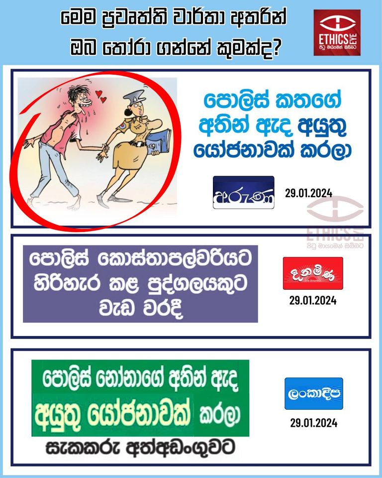 On January 29, 2024, Aruna, Lankadeepa and Dinamina newspapers reported the arrest of an individual for the alleged sexual harassment of a female police officer. The headlines in Lankadeepa and Aruna trivialised the incident. Additionally, Aruna reported the news with a cartoon that trivialised the incident and stirred emotions. Dinamina reported the news without using trivialising