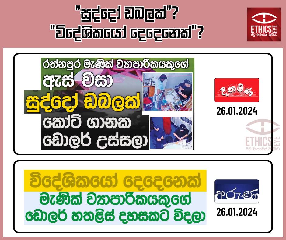 Rathnapura. Dinamina used the derogatory term "Suddo dabalak" (සුද්දෝ ඩබලක්) in its headline, which promotes the marginalization of foreigners based on complexion and is considered unethical. In contrast, Aruna reported the incident ethically, using the appropriate term "Wideshikayo dedenek" (විදේශිකයෝ දෙදෙනෙක්). Media is advised to avoid such derogatory language, as it can foster xenophobic attitudes toward foreign nationals.