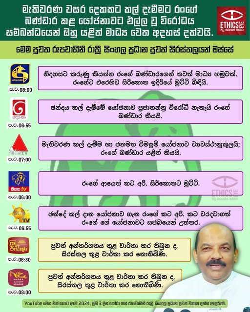 On June 03, 2024, the General Secretary of the United National Party, Range Bandara, held a media briefing at Sirikotha, the party headquarters, regarding the proposed postponement of the presidential and general elections by two years. This infographic illustrates how Swarnavahini, Derana, Sirasa, Siyatha, Hiru, ITN and Rupavahini television channels reported the key points from the briefing in their prime-time Sinhala news bulletins on the same day.