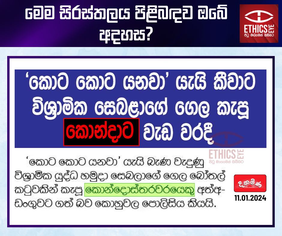 On 11 January 2024, Dinamina newspaper reported an incident in which a bus conductor injured a passenger. The headline used the derogatory term "Konda" (කොන්දා), which could contribute to marginalising the profession and is considered unethical. However, in the article content, Dinamina used the appropriate term "Kondostharavaraya" (කොන්දොස්තරවරයා) to describe the conductor. Media is advised to maintain neutrality in reporting and avoid using language that negatively highlights any profession.
