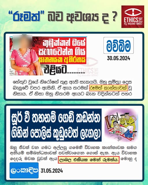 On May 30, 2024, the Mawbima newspaper reported a murder incident, and on May 31, 2024, the Lankadeepa newspaper reported an incident of a drunk person trespassing into a house. In both reports, the newspapers unnecessarily highlighted the woman’s appearance by using the term “Ruumath” (රූමත්), which was irrelevant to the context. The use of such terms in media reporting can contribute to the sexual objectification of women.