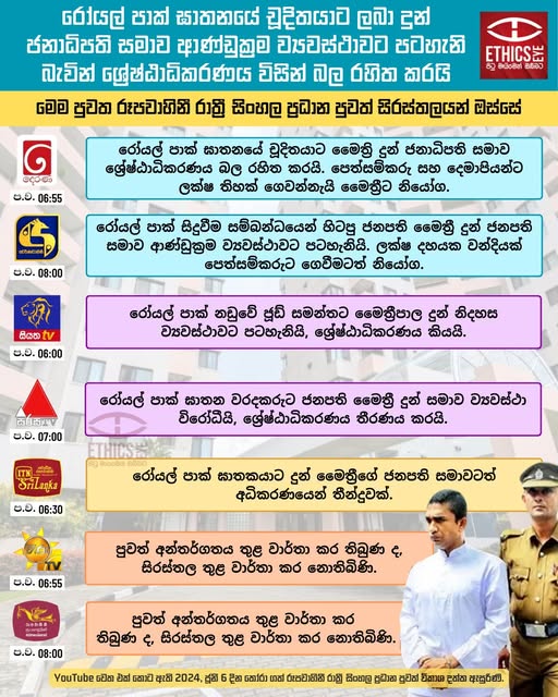 On June 6, 2024, a three-judge Supreme Court bench unanimously decided to nullify former President Sirisena’s decision to pardon Don Samantha Jude Anthony Jayamaha, who was convicted of killing Ivon Johnson at the Royal Park complex. The Court also ordered former President Sirisena to pay compensation of one million rupees to the petitioner. This infographic shows how TV Derana, Swarnavahini, Siyatha, Sirasa, ITN, Hiru TV, and Rupavahini reported the incident in their prime-time Sinhala news bulletins on the same day.