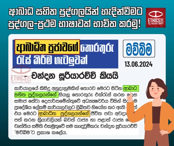 On June 13, 2024, the Mawbima newspaper published an article that contained an ethical violation by failing to use person-first language when describing persons with disabilities. The derogatory term “abadhitha” (ආබාධිත) and the appropriate term “Abadha sahitha” (ආබාධ සහිත) were both used to describe persons with disabilities within the same report. Media outlets are advised to maintain neutrality in their reporting and avoid using language that negatively highlights disabilities or promotes marginalisation.