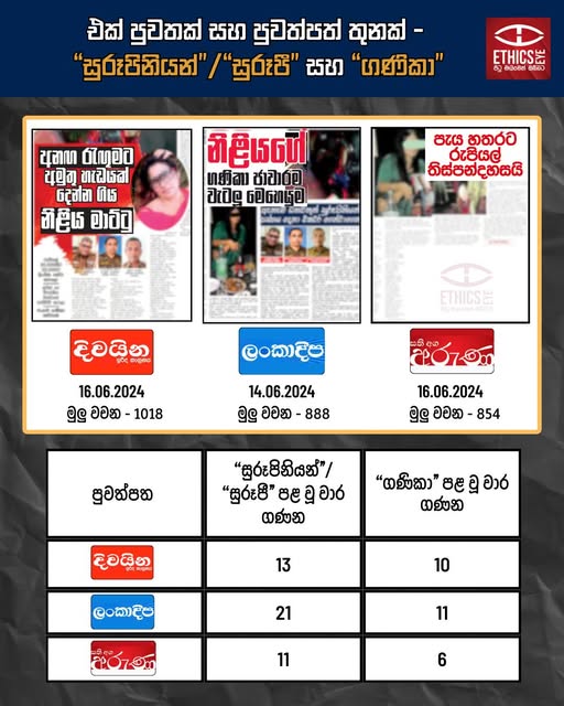 On 14 June 2024, Lankadeepa and on 16 June 2024, Divaina and Sati Aga Aruna newspapers reported on the arrest of an actress accused of using women for prostitution. In their reporting, these newspapers repeatedly and unnecessarily highlighted the physical appearance of women by using the terms “suruupi” (සුරූපී) and “suruupiniyan” (සුරූපිනියන්), along with the marginalising term “ganika” (ගණිකා). This infographic shows how often the word “ganika” is mentioned in news reporting and how often the physical appearance of women is mentioned. The use of such terms reinforces harmful stereotypes and contributes to the sexual objectification of women. Therefore, the media is advised to refrain from using these terms to prevent the sexual objectification and marginalisation of women.