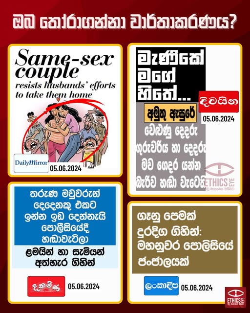 On June 05, 2024, Daily Mirror, Divaina, Dinamina, and Lankadeepa newspapers reported that two married women with children were identified and questioned by police while fleeing their homes. The Daily Mirror used an emotional and prejudiced cartoon, while Divaina and Lankadeepa used the derogatory terms “Amuthu Asure” (අමුතු ඇසුරේ) and “Gehenu Pemak” (ගැහැනු පෙමක්) respectively in the headlines that marginalised women. The media should refrain from such reporting and focus only on relevant facts to prevent prejudice.