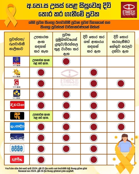 On June 25, 2024, Siyatha, Hiru TV, TV Derana, and Swarnawahini television channels and on June 26, 2024, Divaina, Ada, Lankadeepa, Aruna, Mawbima, and Dinamina newspapers reported the suicide of an Advanced Level student in Ulapane. Only the Siyatha television channel and Ada newspaper included helplines in their coverage, while the others did not. Except for Hiru TV, TV Derana and Dinamina newspaper, other media reported the incident prominently in the main headlines. Siyatha TV is the only media that did not describe the method used in the suicide. TV Derana along with the Divaina, Ada and Lankadeepa newspapers reported alleged reason for the suicide. The media is advised to avoid reporting on suicides without providing helplines, stating reasons for them or describing the methods used, as these can act as a catalyst for further suicides.