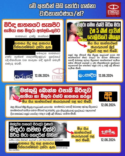 On June 12, 2024, the Sinhala newspapers Aruna, Lankadeepa, Ada and Dinamina reported, citing the Thalangama Police, that two people, including the deceased's husband, had been arrested on suspicion of murder after allegedly attempting to mislead the police by filing a false complaint that his wife had been mysteriously murdered. Dinamina, Ada, and Lankadeepa published a photograph of the deceased woman, while Aruna and Dinamina provided a detailed account of the incident. These reports used sensitive language and emphasised personal details, aiming to intensify the emotional and frightening aspects of the story. In reporting on cases of murder or death, the media is advised to uphold ethical standards by avoiding the disclosure of personal information or photographs that reveal the identities of victims as well as suspects, and to refrain from publishing information that may cause unnecessary distress to the family or friends of the deceased.