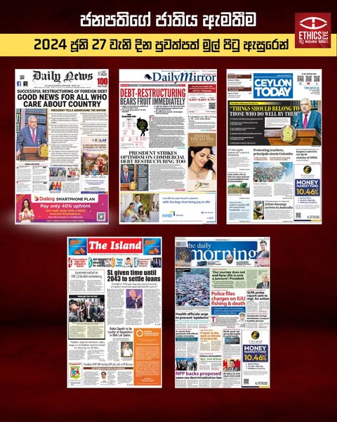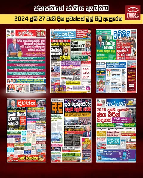 These infographics demonstrate how President Ranil Wickremesinghe's address to the nation on June 26, 2024, and the key points he made were reported on the front pages of both Sinhala and English-language newspapers on June 27, 2024.