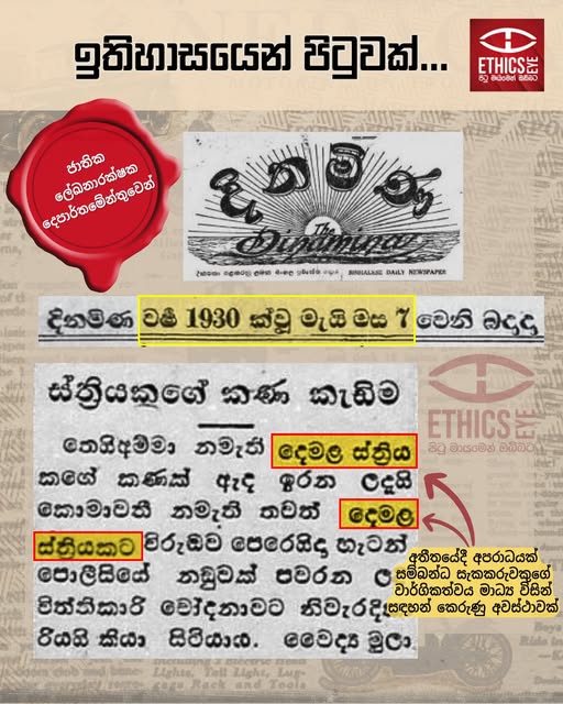 On May 07, 1930, the Dinamina newspaper reported an incident in which one woman assaulted and injured another. The article used the term “Demala sthriya” (දෙමළ ස්ත්රිය) to describe a woman, even though their ethnicity was irrelevant to the incident. Using such terms promotes ethnic stereotyping. Media is advised to avoid such language, especially in negative contexts, as it violates ethical reporting guidelines.