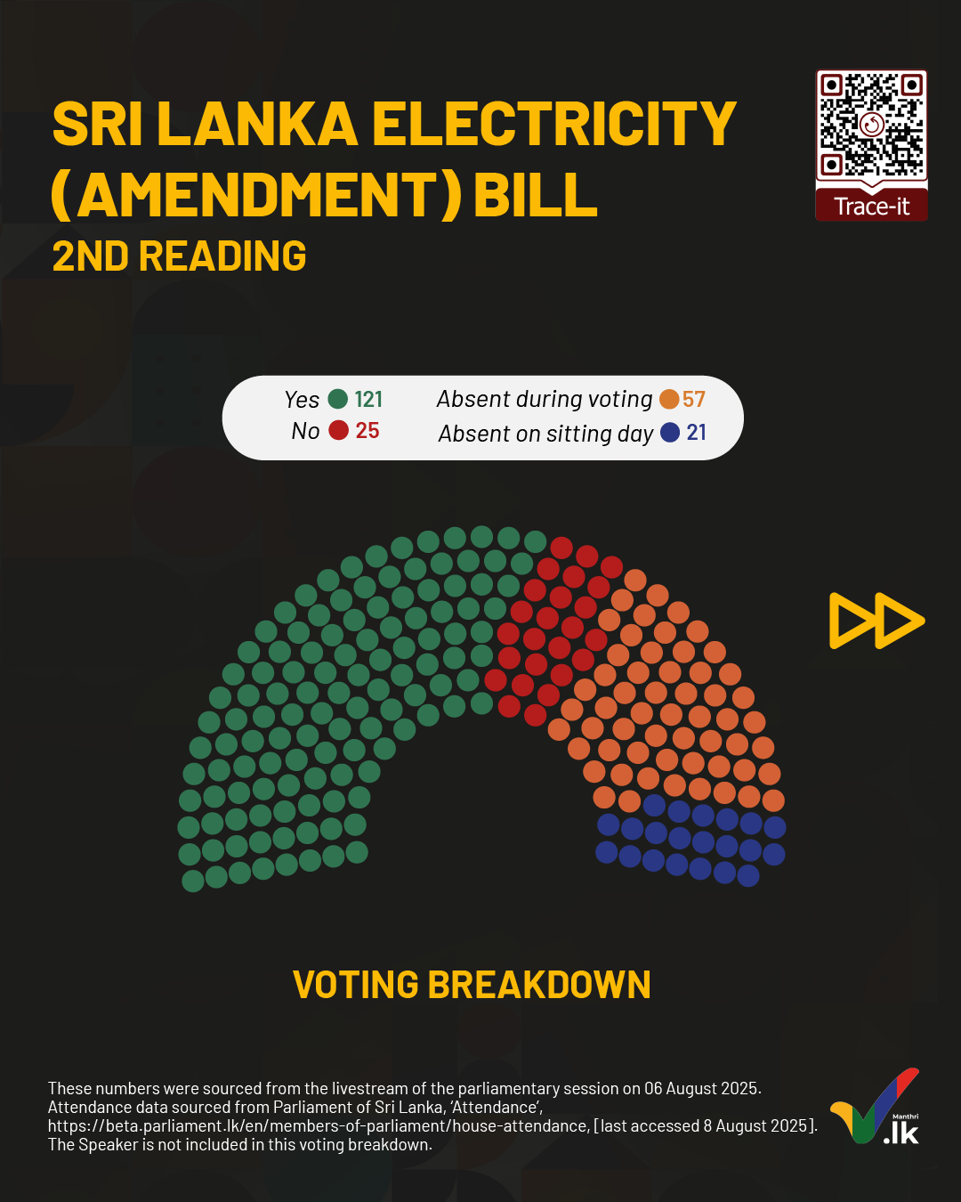 On 6 August 2025, Parliament held a vote on the Sri Lanka Electricity (Amendment) Bill during the second reading. The vote was passed with 121 votes in favour and 25 against.