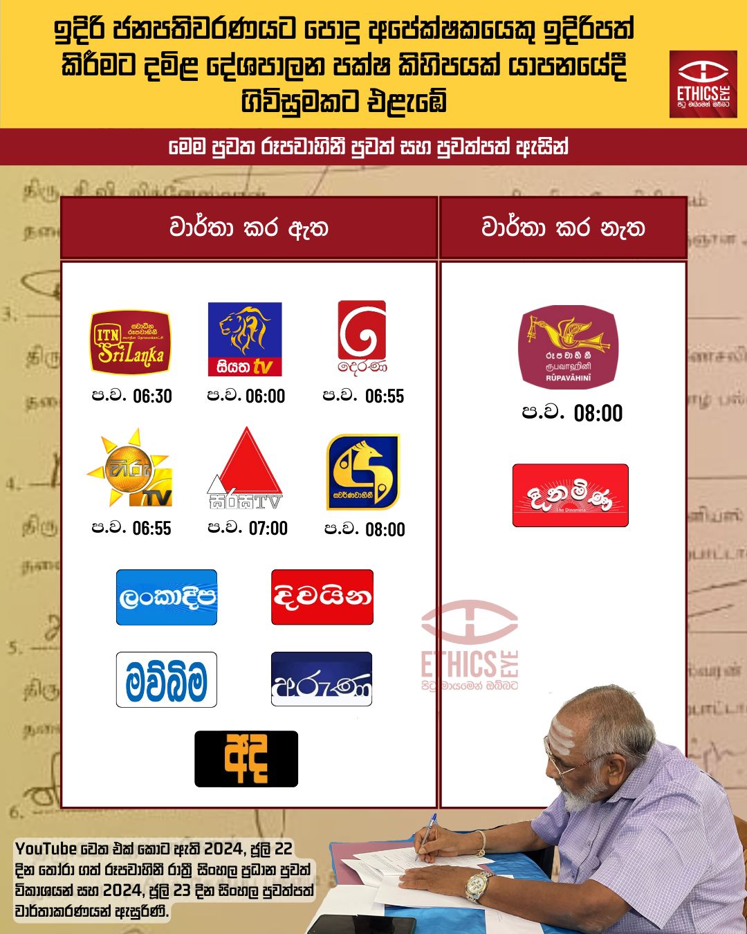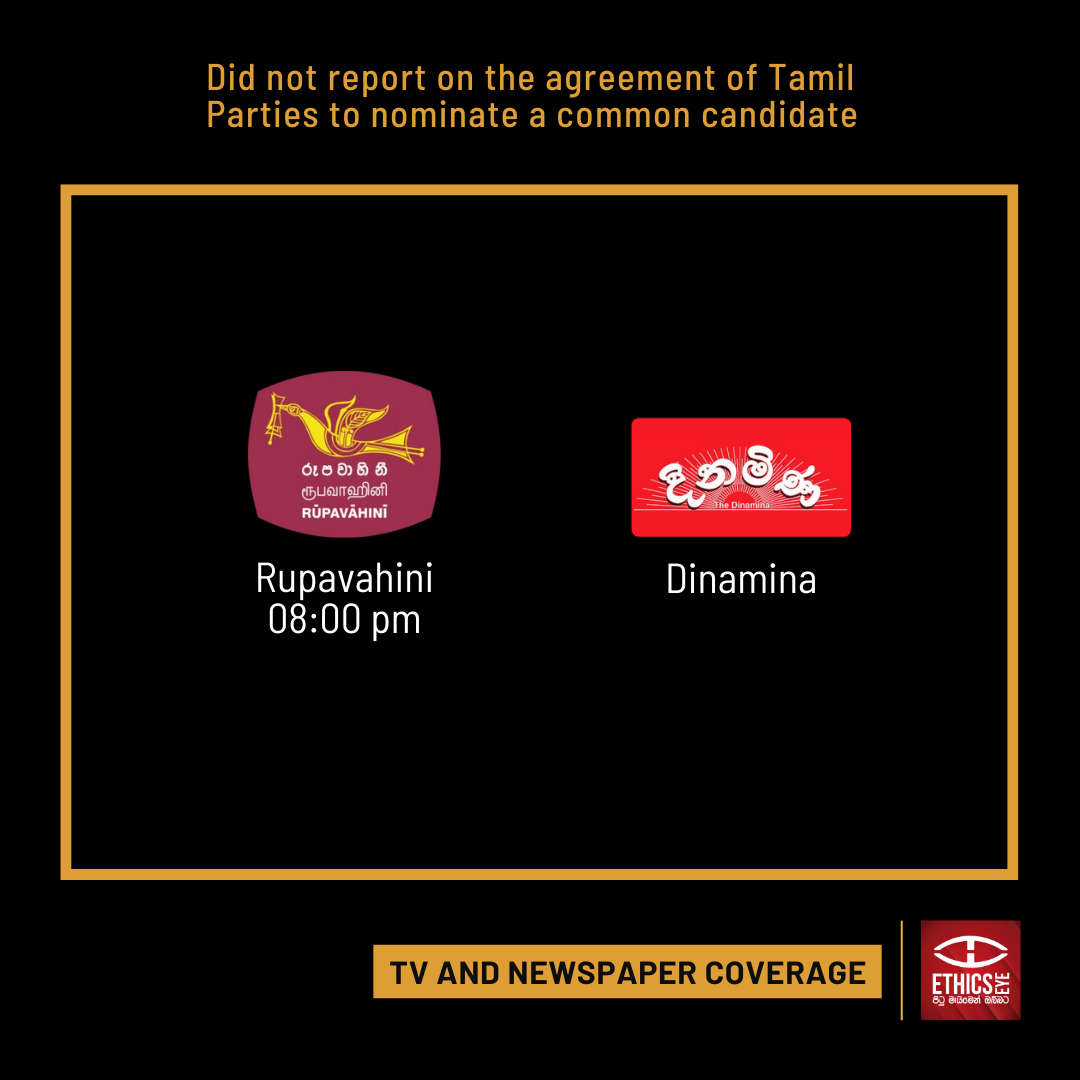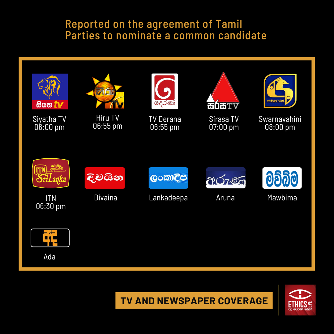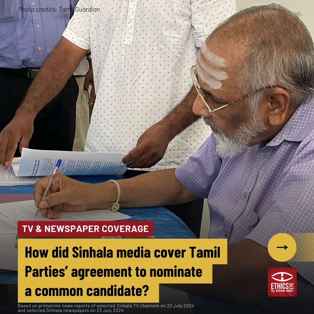 On July 22 and 23, 2024, media reported that several Tamil political parties and civil society organisations had signed an agreement at the Selva Memorial Hall in Jaffna to field a common candidate for the upcoming presidential election. This infographic shows which media organisations covered the event in their Sinhala prime time television news on July 22, 2024, and in Sinhala newspapers on July 23, 2024. ITN, Siyatha, TV Derana, Hiru TV, Sirasa, and Swarnavahini television channels, as well as the Lankadeepa, Divaina, Mawbima, Aruna, and Ada newspapers reported the news but Rupavahini and the Dinamina newspaper did not report it.