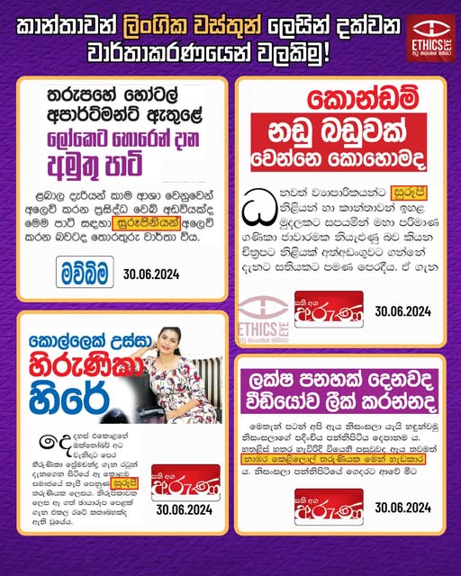On June 30, 2024, Sathi Aga Aruna and Mawbima newspapers reported four incidents using derogatory terms such as “Surupi” (සුරූපී), “Surupiniyan” (සුරූපිනියන්), and “Nambara kelilol tharuniya” (නාඹර කෙළිලොල් තරුණිය) to describe women which is considered unethical. These terms unnecessarily emphasized the women’s appearance, which was irrelevant to the stories and contributed to their sexual objectification.
