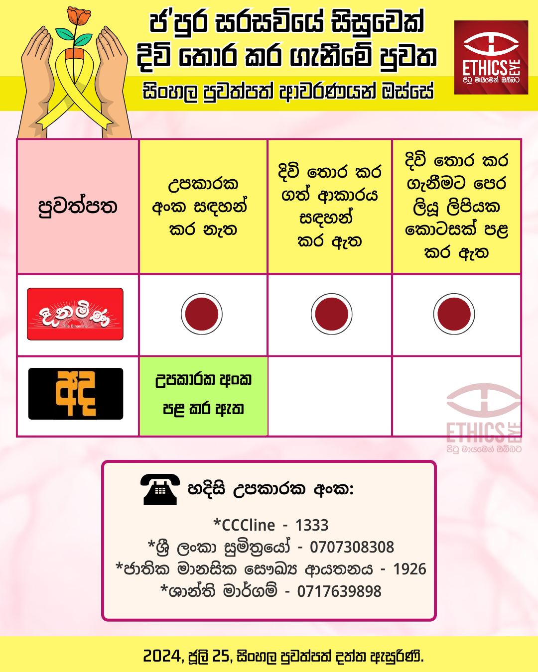 Ethics Eye (Colombo: Verité Research, 2024-07-15)This infographic shows how a suicide incident of a schoolgirl in Welipanna area was reported in the Sinhala newspapers published on July 15, 2024. Without following media ethical guidelines, Ada, Aruna and Dinamina have ... -