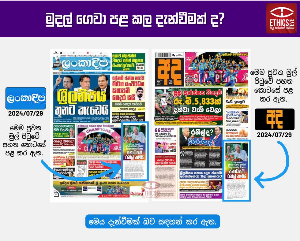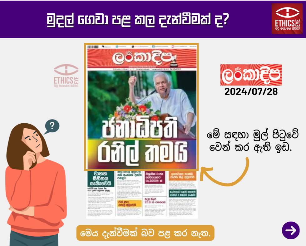 On July 28, 2024, Irida Lankadeepa, and on July 29, 2024, Lankadeepa and Ada, published an election campaign advertisement with the headline “Janadhipathi Ranil Thamai.” Lankadeepa and Ada allocated a small section on the front page and clearly identified it as an advertisement. However, Irida Lankadeepa published it in a large section of the front page without indicating it was an advertisement. This is misleading reporting and violates media ethical standards.
