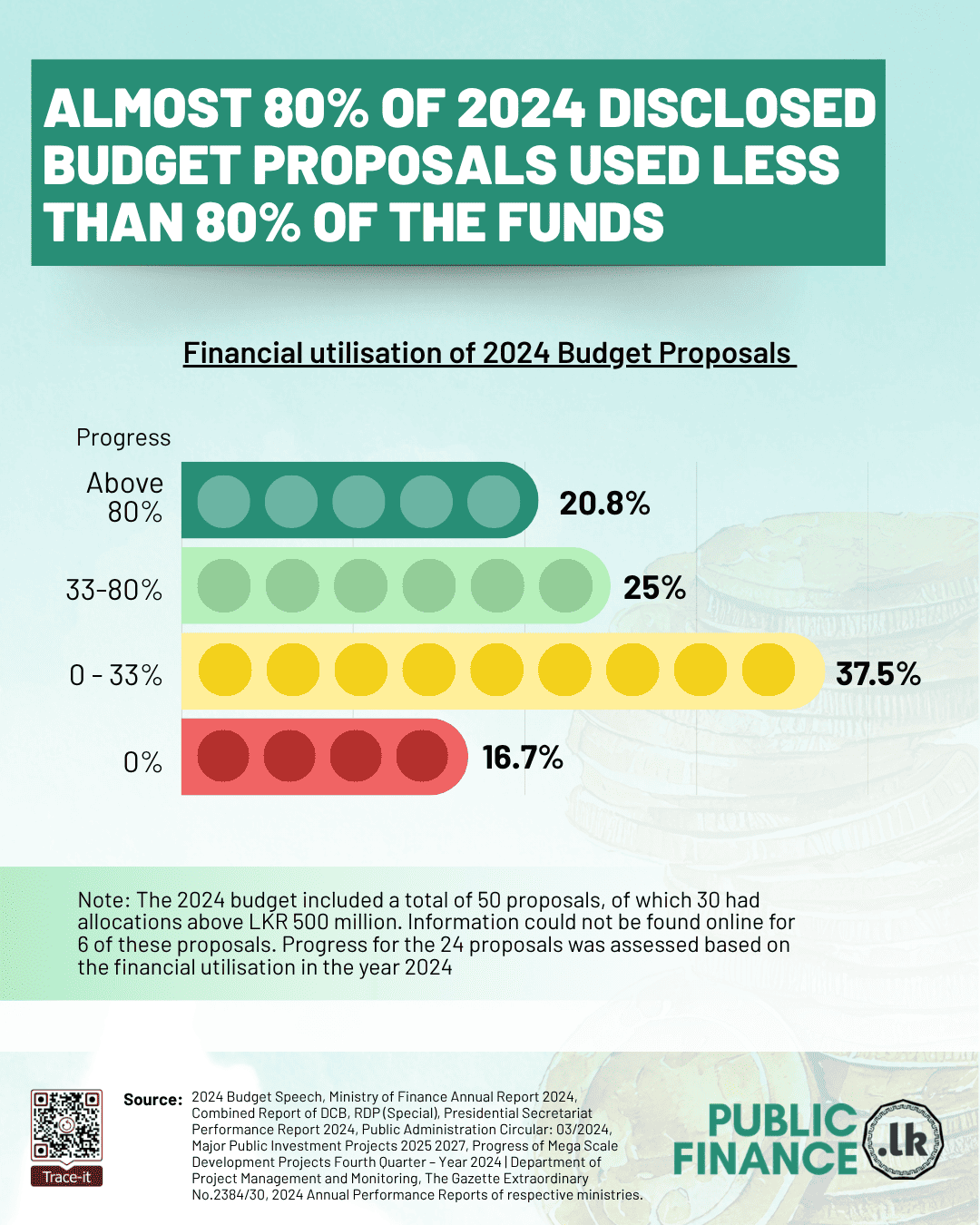 In November 2023, the then Finance Minister, President Ranil Wickremesinghe, presented 50 expenditure budget proposals with a value of LKR 212,740 million to Parliament. Of these, 24 proposals worth over LKR 500 million had publicly available information and were assessed for progress.