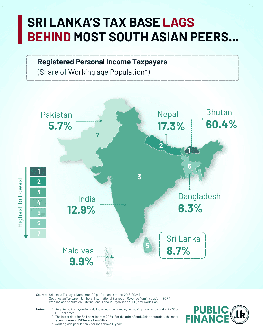 Sri Lanka’s current position in South Asia is due to Sri Lanka's increase in its taxpayer base from 1.4% in 2022 to 8.7% in 2024. This improvement is mainly because the government reduced the tax-free income threshold from LKR 3 million to LKR 1.2 million annually in January 2023. In 2020, the government increased the personal income tax threshold from LKR 500,000 to LKR 3 million per year, a 500% rise, which caused the taxpayer rate to drop from 8.7% in 2019 to 1.4% in 2022.