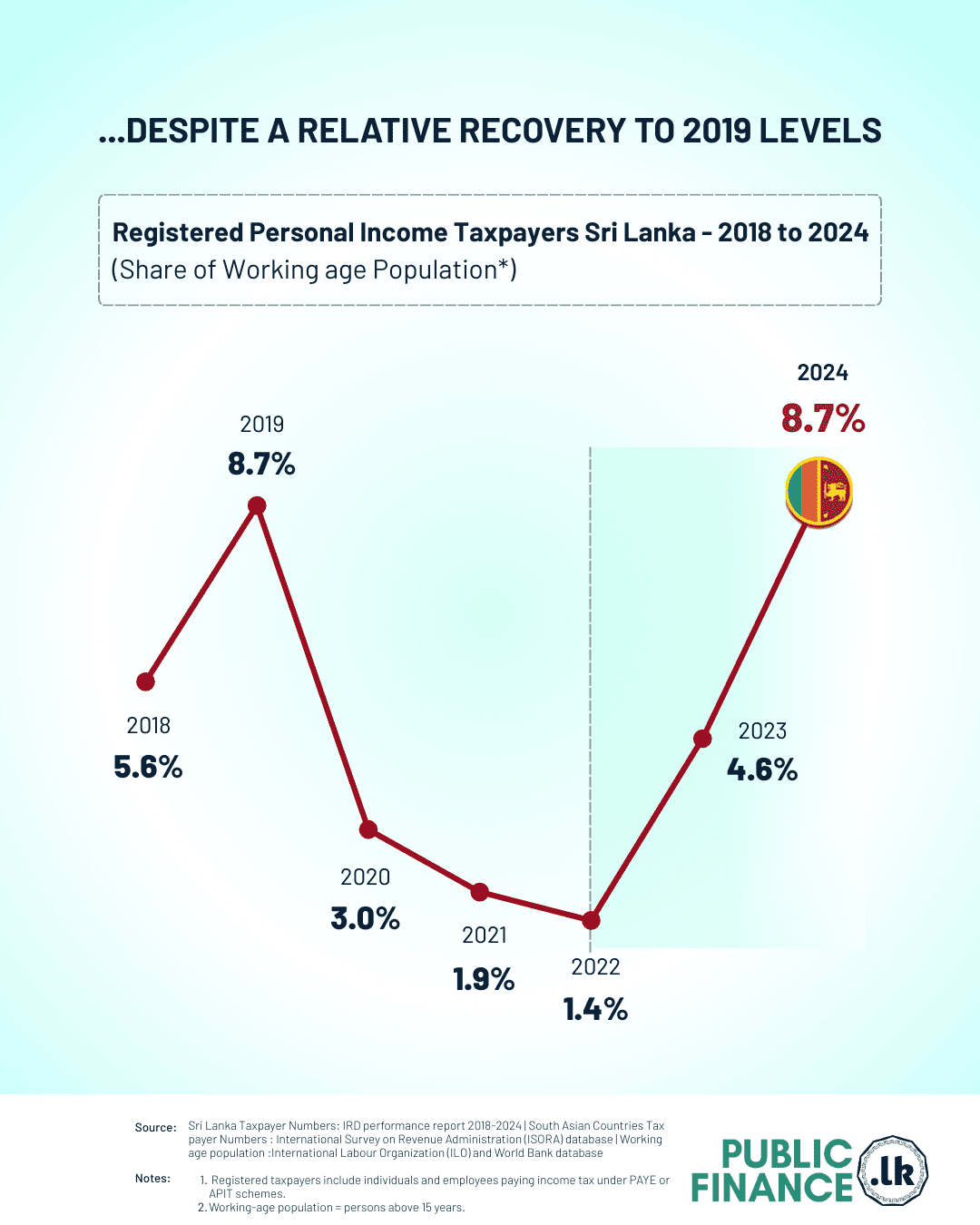 The number of people registered for personal income tax (taxpayer base) in Sri Lanka recovered in 2024 to the high levels seen in 2019. However, despite this rebound, Sri Lanka still lags behind its regional peers.