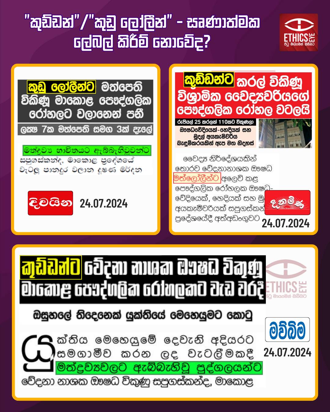 On July 24, 2024, Divaina, Dinamina, and Mawbima newspapers reported the arrest of three individuals at a private hospital for allegedly selling painkillers to drug users without a doctor’s prescription. All newspaper used derogatory terms such as “Kuddanta” (කුඩ්ඩන්ට), “Kuduloleen” (කුඩු ලෝලීන්) in the headlines while Dinamina also used “Mathloleen” (මත්ලෝලීන්) in the content. Using such language is unethical, as it increases stigma against people who use drugs, makes reintegration after rehabilitation more difficult, and obstructs efforts to address drug-related social issues. However, both Divaina and Mawbima used the appropriate term “Mathdrawya bhawithayata abbahi wu pudgalayan” (මත්ද්රව්ය භාවිතයට ඇබ්බැහි වූ පුද්ගලයන්) in the content of their reports.