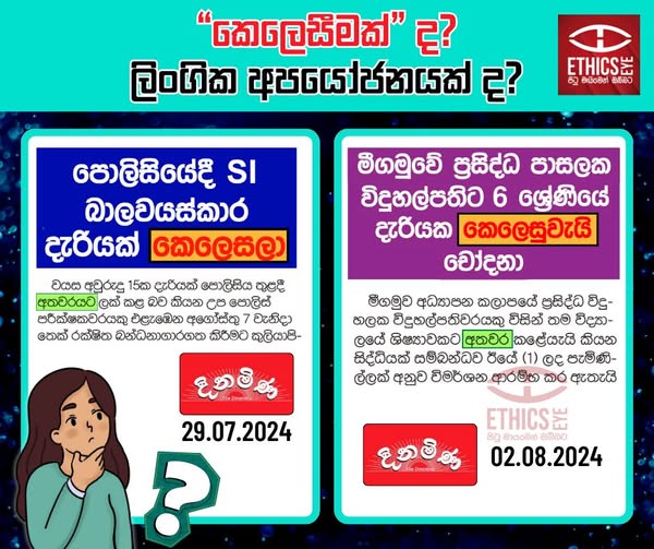 The reports published on 29 July 2024 and 2 August 2024 in Dinamina used the term 'keleseema' (කෙලෙසීම) in headlines to describe the sexual assaults. This term implies impurity or uncleanliness and unfairly stigmatizes the survivor. In the article content, however, the term 'අතවර' (Athavara) was used in accordance with media ethical guidelines.