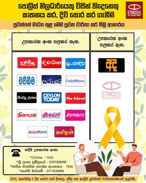 The triple murder and subsequent suicide of a police officer in Inginiyagala, Monaragala, on August 4, 2024, was reported by English, Sinhala, and Tamil newspapers on August 5. However, only Ada Sinhala newspaper included the emergency helpline number with the news.