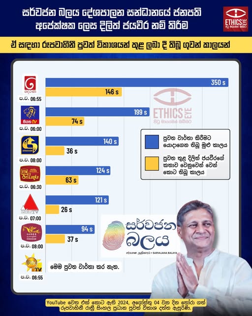 සර්වජන බලය දේශපාලන සන්ධානයේ ජනපති අපේක්ෂකයා ලෙස දිලිත් ජයවීර නම් කිරීමේ පුවත සඳහා රූපවාහිනී පුවත් විකාශන තුළ ලබා දී තිබූ ගුවන් කාලය