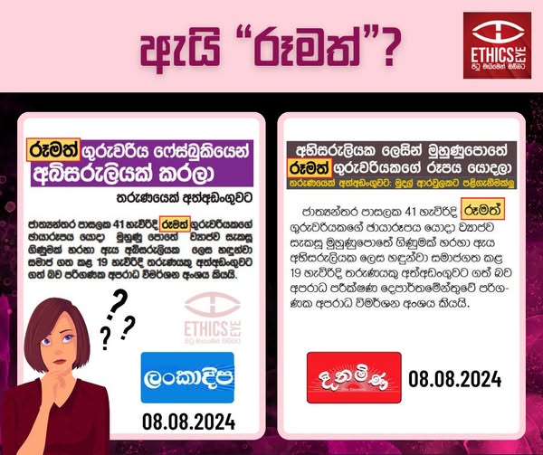 On 8 August 2024, Lankadeepa and Dinamina reported the arrest of an individual who used a photo of an international school teacher to maintain a fake Facebook account and falsely labeled her a sex worker. Both newspapers described the teacher’s appearance using the term "රූමත්" (Roomath), which was unrelated to the news context. Such language in media reporting can contribute to the sexual objectification of women.