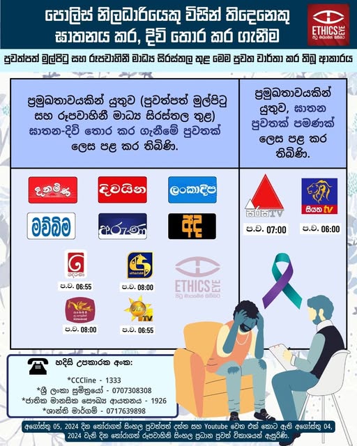 This infographic shows how the triple murder and suicide involving a police officer in Inginiyagala, Monaragala on August 4, 2024, was prominently covered in Sinhala television headlines that day and in the front pages of Sinhala newspapers on August 5, 2024.
