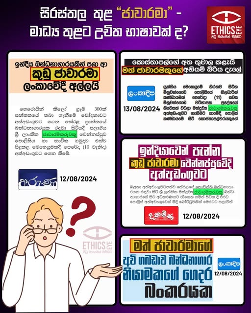 On 12 August 2024, Aruna and Dinamina newspapers, and on 12 and 13 August 2024, Lankadeepa newspaper, reported the arrest of a drug dealer, using the derogatory term "ජාවාරමා" (Jawarama) in headlines and "ජාවාරම්කරුවා" in the content. The media has a responsibility to report news objectively and to avoid language that could create prejudice.
