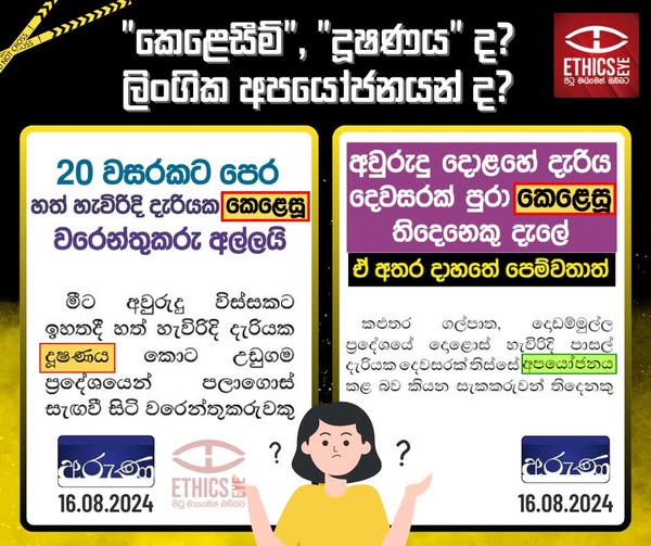 On 16 August 2024, Aruna reported two sexual assault incidents using the terms "කෙළෙසීම" (keleseema) and "දූෂණය" (dooshanaya), which imply the victims are "polluted." Referring to survivors as dirty or impure in the media increases social stigma. The media is therefore encouraged to use "ලිංගික අපයයෝජනය" and avoid derogatory language.