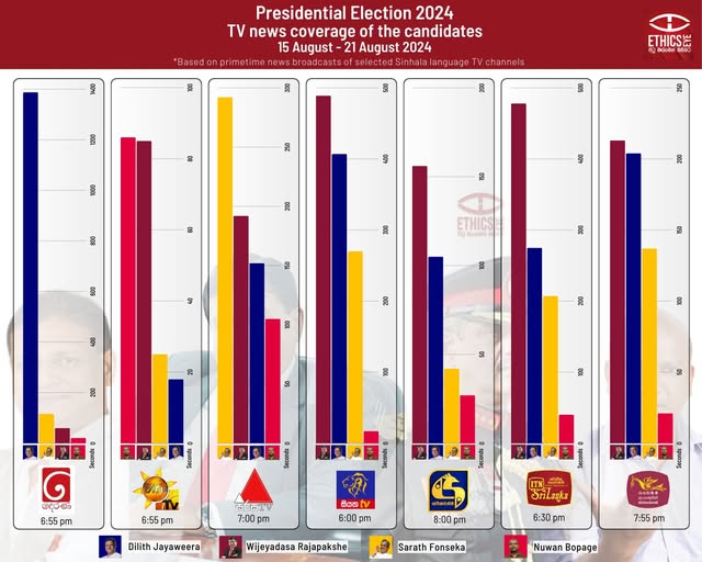 This infographic presents the airtime allocated to 2024 presidential candidates Dilith Jayaweera, Wijedasa Rajapaksa, Sarath Fonseka, and Nuwan Bopage on prime time Sinhala news broadcasts. Data was collected from TV Derana, Hiru, Sirasa, Siyatha, Swarnavahini, ITN, and Rupavahini between August 15 and 21.