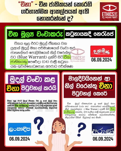 On September 6, 2024, Lankadeepa, Aruna, and Dinamina newspapers reported a case involving a Chinese national wanted by Interpol for financial fraud in China. Lankadeepa and Aruna used the derogatory term "චීනා" (Cheena) in their headlines but used the correct term "චීන ජාතිකයෙකු" (Chinese national) in the article content. Media is advised to avoid derogatory language, especially in negative contexts, as it can marginalise foreign nationals. Dinamina adhered to media ethical guidelines by using "Chinese national" in both the headline and content.