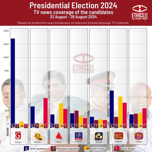 This infographic presents the airtime allocated to 2024 presidential candidates Dilith Jayaweera, Wijedasa Rajapaksa, Sarath Fonseka, and Nuwan Bopage on prime time Sinhala news broadcasts. Data was collected from TV Derana, Hiru, Sirasa, Siyatha, Swarnavahini, ITN, and Rupavahini between 22 August and 28 August 2024.