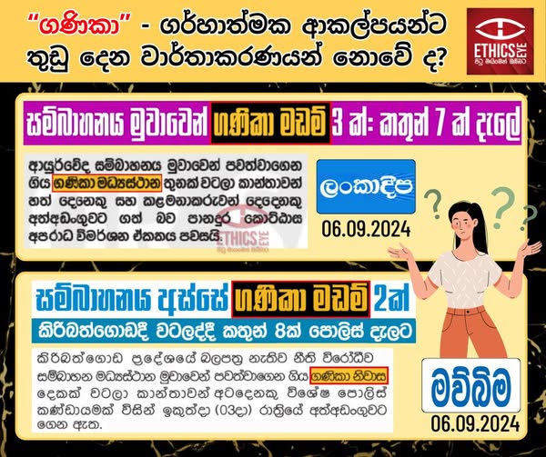 On 6 September 2024 Lankadeepa and Mawbima reported on raids of sex service establishments that were operated under the guise of massage parlors, using the derogatory terms “ගණිකා නිවාස” and “ගණිකා මඩම්” in both headlines and content. Stigmatizing attitudes in society linked to the term "prostitute" increase marginalisation and worsen the social problems they face. The media is encouraged to avoid such derogatory terms and instead use "ලිංගික ශ්රමිකයා" (sex workers), "ලිංගික සේවය" (sex service), or "ලිංගික සේවා සපයන ස්ථාන" (sex service centres).