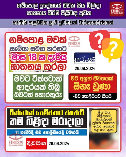 On September 26, 2024, the Sinhala newspapers Aruna and Divaina sensationally reported the murder of an 18-month-old child by her 21-year-old mother from Gampola. Divaina also published an unblurred photo of the child, disclosing her identity.