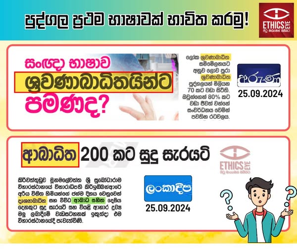 On 25 September 2024, articles in Aruna and Lankadeepa newspapers did not use person-first language when referring to persons with disabilities, leading to discrimination. Aruna used the derogatory term “ශ්රවණාබාධිත” in both the headline and content, while Lankadeepa used “ආබාධිත” in the headline and “දෘශ්යාබාධිත” in the content.