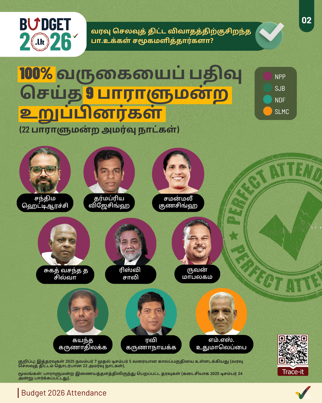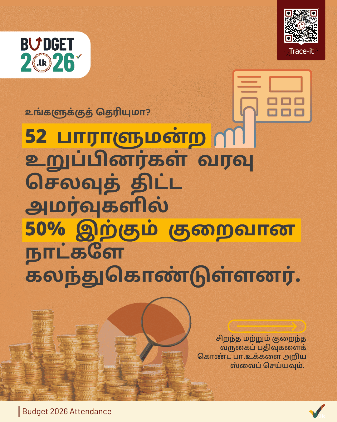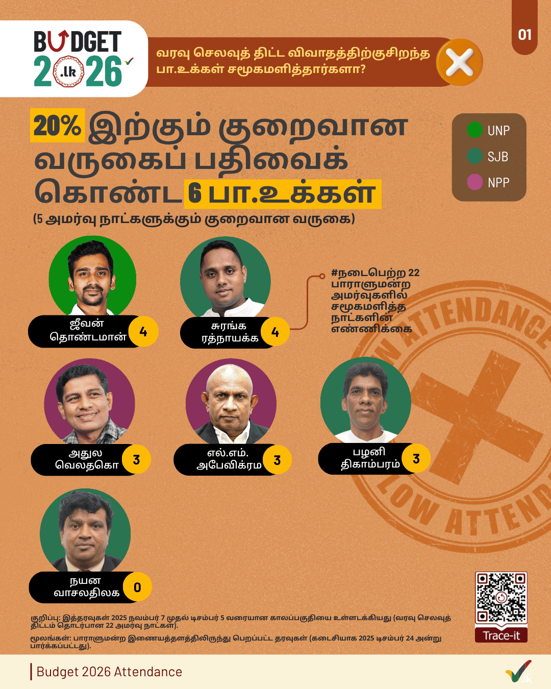 Parliamentary Research Team (Manthri.lk, 2026-03-27)This infographic shows MP attendance for the 'Budget 2026' proceedings held over 22 Parliament sittings from 7 November to 5 December 2025. Of the MPs, 52 attended less than 50% of these sittings, and 6 attended less than ... -