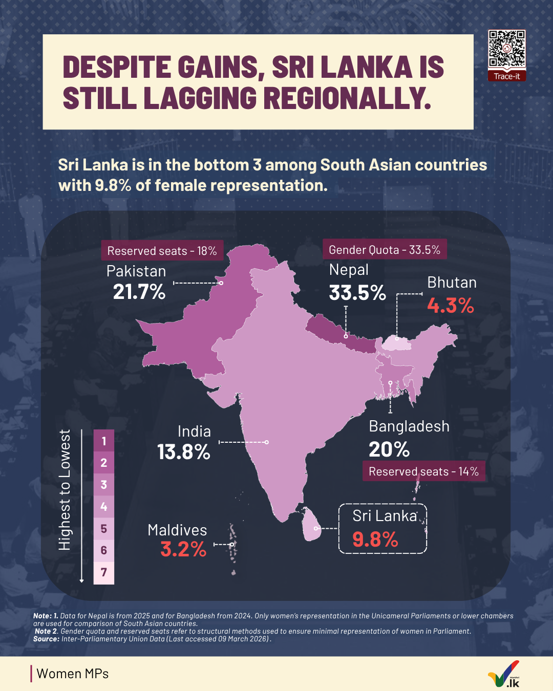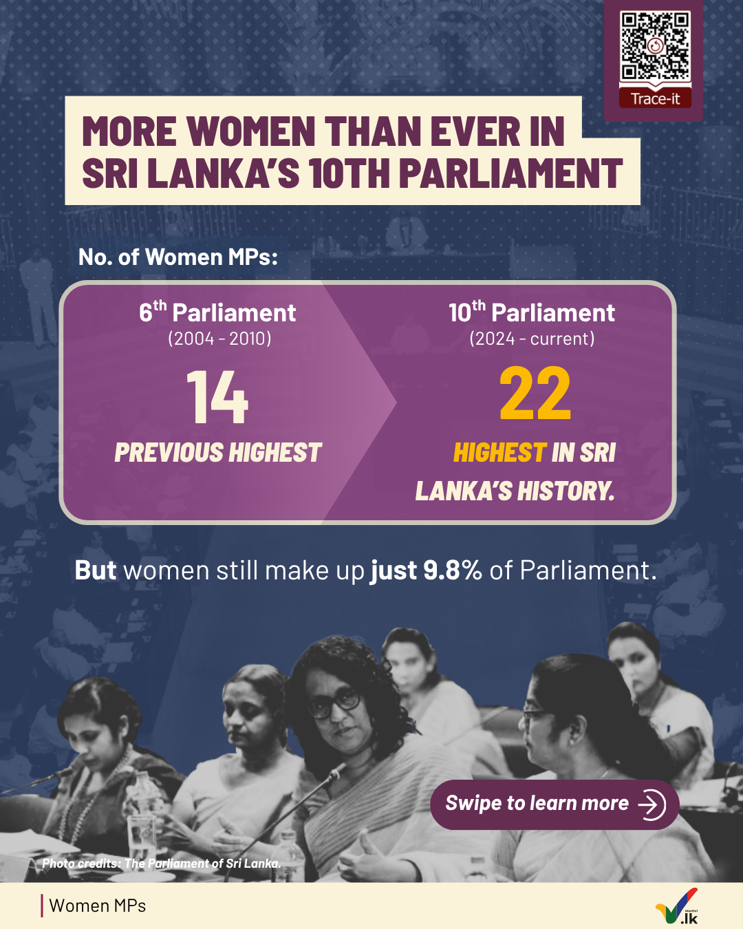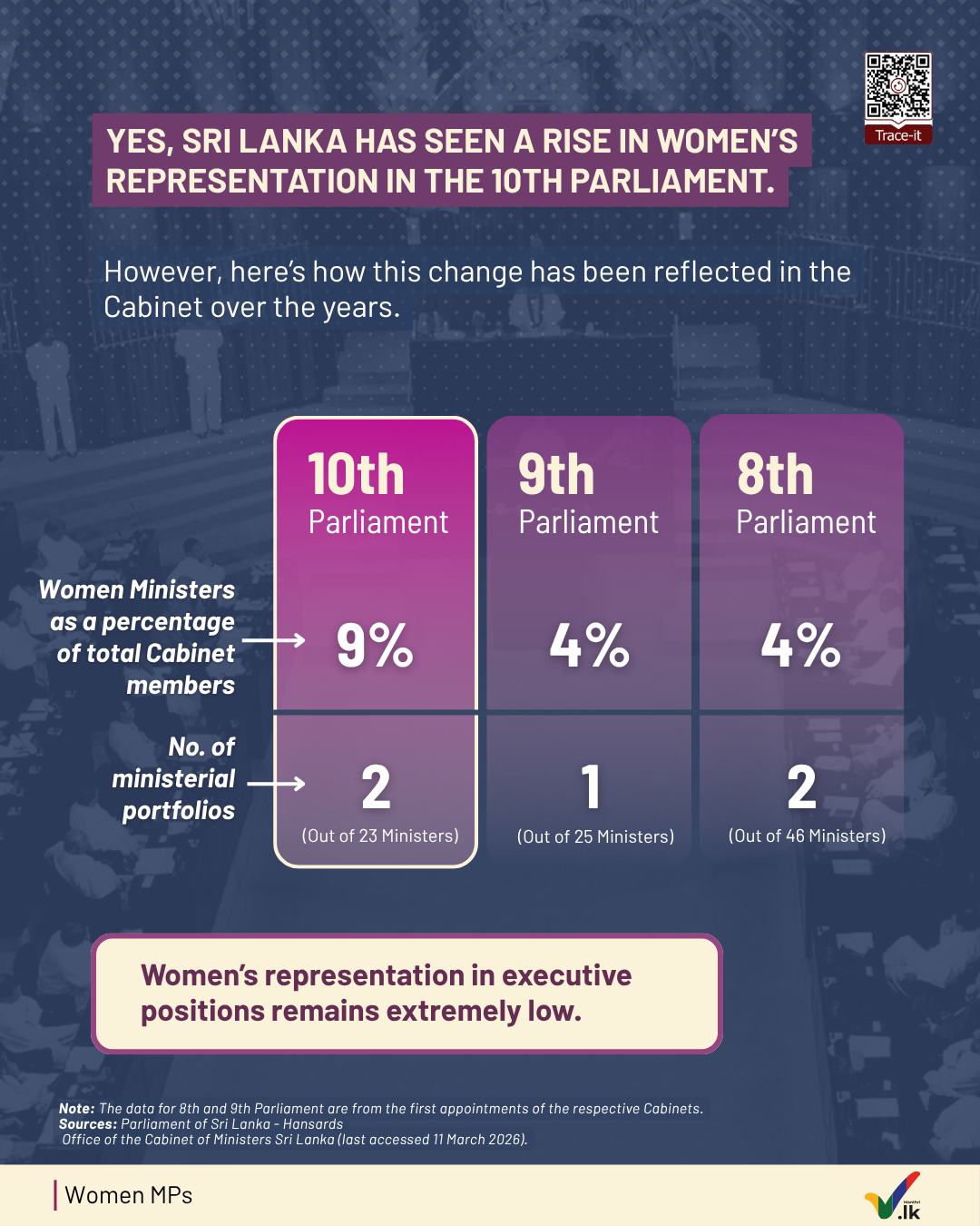 This infographic presents female representation in Sri Lanka’s 10th parliament of and compares it with other South Asian countries. Sri Lanka now has the highest number of women MPs (22) in its history, but still the Cabinet representation remains low. With 9.8% female representation, Sri Lanka ranks among the bottom three in South Asia.